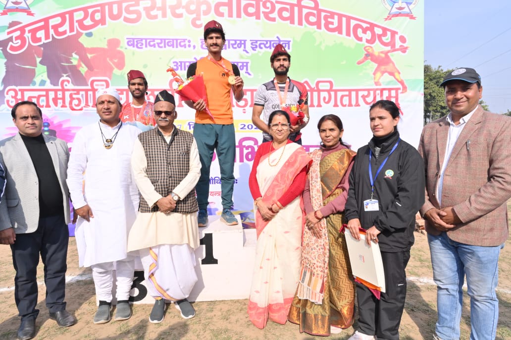 उत्तराखंड संस्कृत विश्वविद्यालय में आयोजित तीन दिवसीय अंतर महाविद्यालय क्रीडा प्रतियोगिता की 100 मीटर, 200 मीटर और लंबी कूद में प्रथम स्थान प्राप्त कर संस्कृत विवि के छात्र आकाश चौहान चैंपियन बने