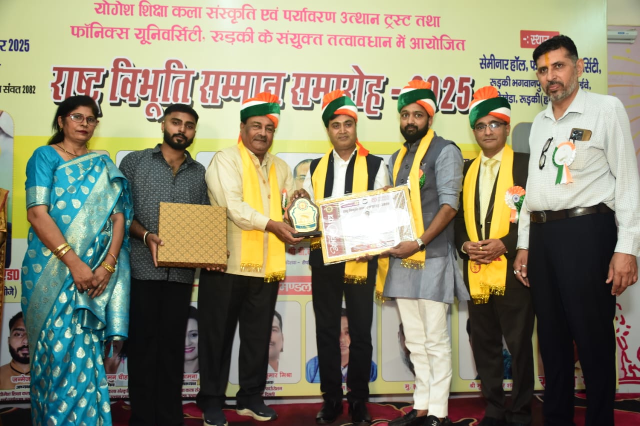 हरिद्वार। योगेश शिक्षा कला संस्कृति एवं पर्यावरण उत्थान ट्रस्ट, हरिद्वार व फॉनिक्स रुड़की के संयुक्त तत्त्वावधान में आयोजित राष्ट्र विभूति सम्मान समारोह 2025 में समस्त भारतवर्ष के विभिन्न राज्यों से चयनित 115 से अधिक विभूतियों को सम्मानित किया गया। देश के “प्रथम राष्ट्र विभूति सम्मान समारोह-2025” का आयोजन उत्तराखण्ड की हिमालय की गोद में माँ गंगा के तट पर विराजमान प्रसिद्ध शिक्षा नगरी रुड़की की पावन धरा पर फॉनिक्स यूनिवर्सिटी, रुड़की में किया गया जिसमें ट्रस्ट के समन्वयक श्री संजय वत्स जी ने तथा विश्वविद्यालय के चेयरमैन श्रीर चैरब जैन कुलपति प्रो. मनीष पाण्डेय जी, प्रो. डॉ. पंकज कुमार मिश्रा, कुलपति फ्यूचर यूनिवर्सिटी बरेली, डॉ. प्रिया जाडू पूर्व निदेशक राज्य संसाधन केन्द्र उत्तराखण्ड, डॉ बी.एल.यादव निदेशक सीएमडी इण्टरनेशनल स्कूल दिल्ली,श्री डी के शर्मा निदेशक शेफील्ड स्कूल रुड़की, श्री प्रदीप कुमार श्रीवास्तव एवं डॉ. नवीन खन्ना आदि मुख्य अतिथियों के द्वारा भारतवर्ष की शताधिक राष्ट्र विभूतियों को यह सम्मान स्मृति चिह्न, अंगवस्त्र, सम्मान की सूचक पगड़ी, हृदय फलक, प्रशस्ति पत्र तथा समय की सूचक घड़ी उपहारस्वरूप प्रदान कर विभूतियों को अलंकृत व्यक्तित्व में चार चांद लगाये। देश की महान् विभूतियों को सम्मानित कर रुड़की स्वयं गौरवांवित होकर ऐतिहासिक गौरवमय पलों का साक्षी बना।